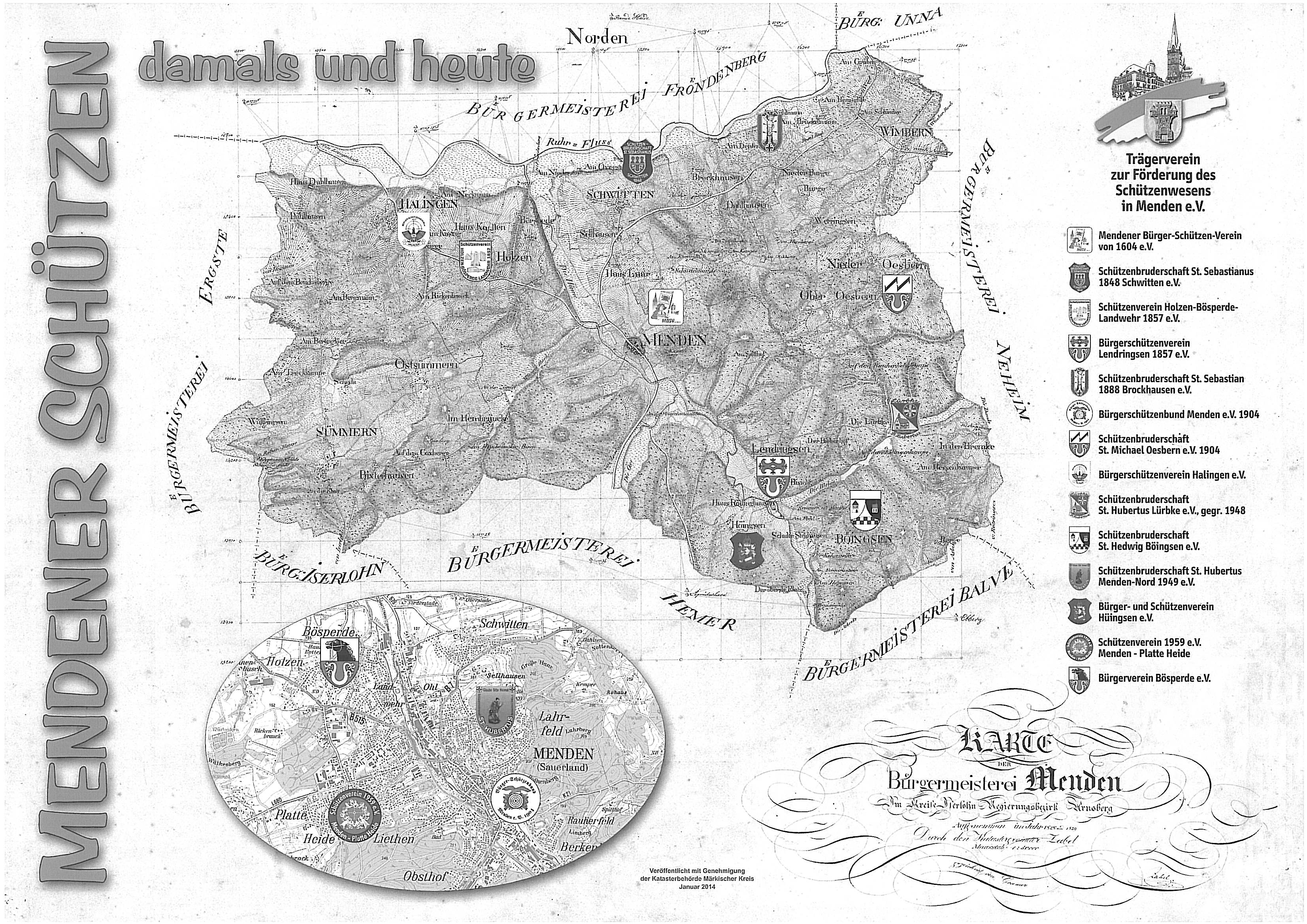 Für die Schützenausstellung hat Hans-Joachim Mertens, amtierender Schützenkönig beim Schützenverein 1959 e.V. Menden – Platte Heide, eine gelungene Kombination aus einer alten Karte der „Bürgermeisterei Menden“ und den Logos und Namen der Mendener Schützenvereine und Schützenbruderschaften erstellt. Die Ausstellungshelfer erhielten als Dankeschön die ersten druckfrischen Exemplare dieser Karte. Interessierte Bürger und Schützen können diesen Sonderdruck beim Trägervereins-Geschäftsführer Meinolf Luig gegen eine geringe Schutzgebühr erhalten.